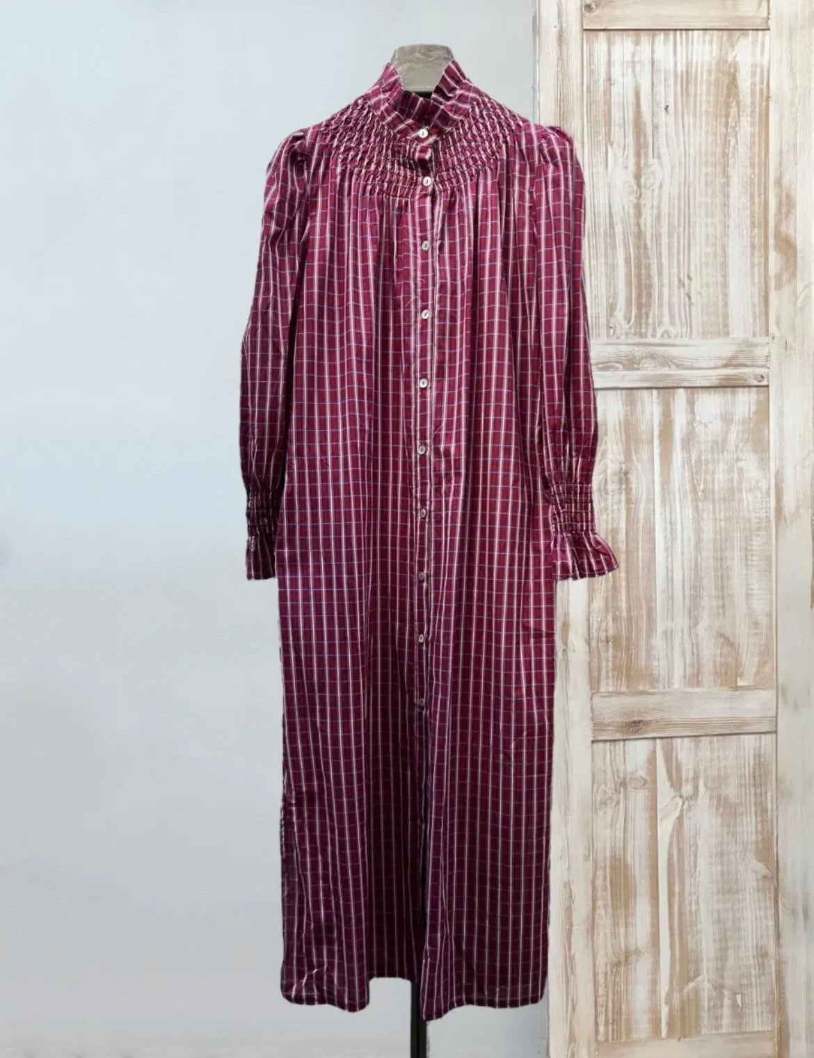 Vestido fruncido cuadros color vino